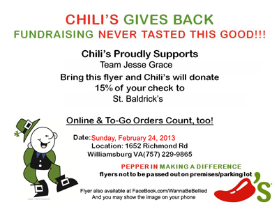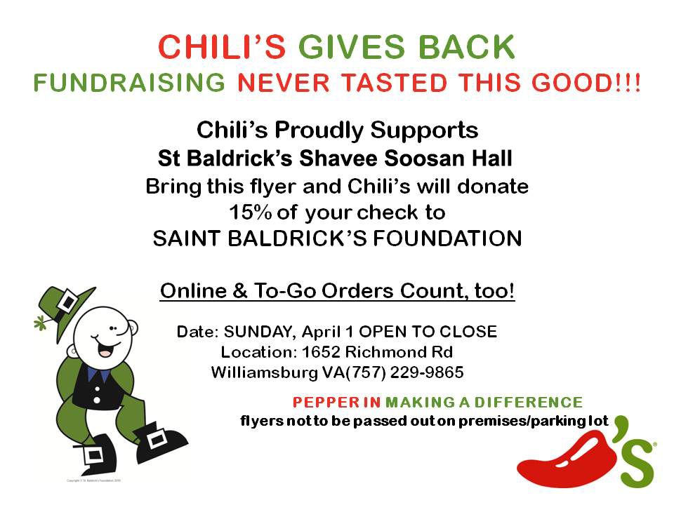 Click on the picture below, print, and take to our Williamsburg Chili’s, and 15% of your meal will be donated to help research cures for